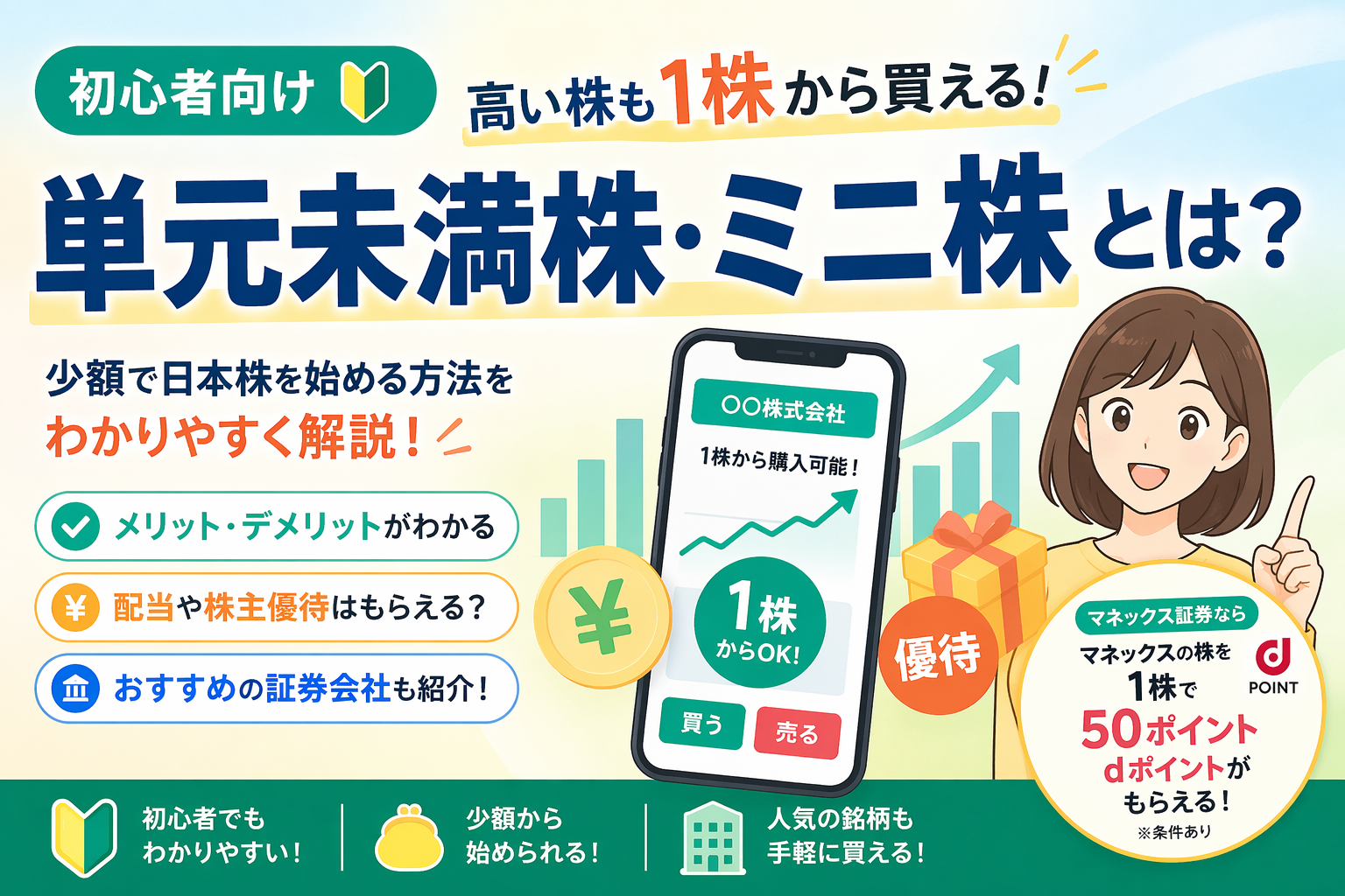 この記事では、単元未満株・ミニ株の意味、メリット・デメリット、配当や優待の考え方、買える証券会社まで初心者向けにわかりやすくまとめます。